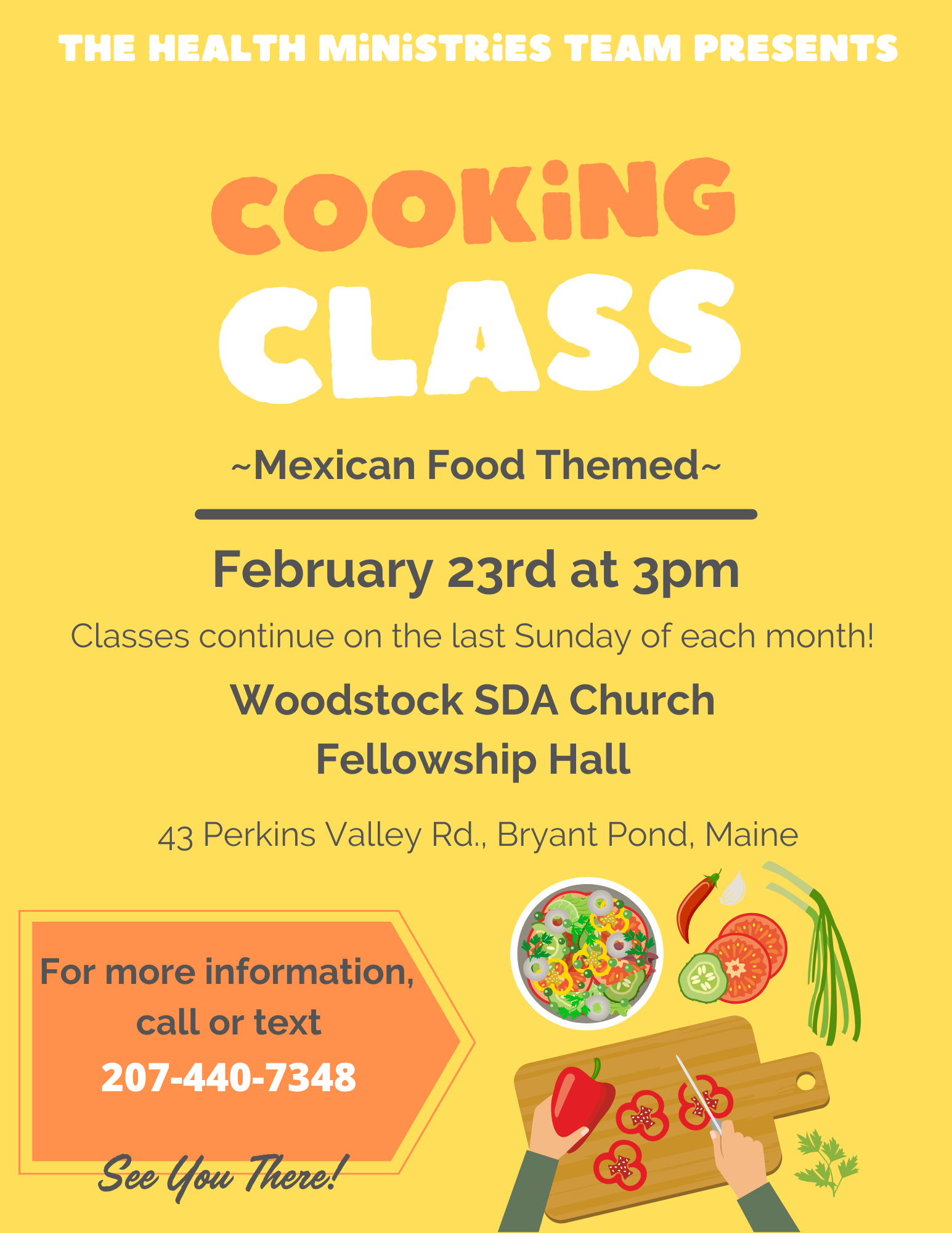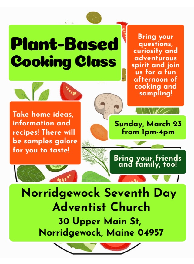 Join us for a fun afternoon of cooking and samplings. Bring your friends and family. Sunday, March 23, 2025 from 1pm-4pm at the Norridgewock SDA Church, 30 Upper Main St, Norridgewock, ME