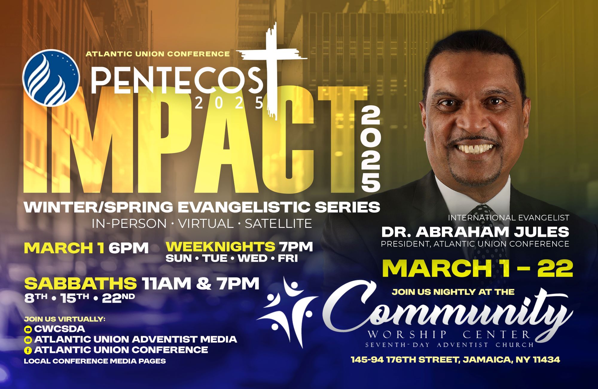 Join the evangelistic series nightly from March 1-22. The speaker is Dr. Abraham Jules, President for the Atlantic Union. It will be livestreamed.