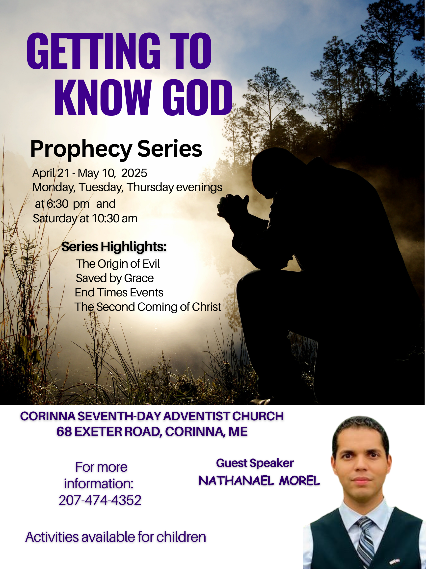 A Prophecy Series "GETTING TO KNOW GOD" to be held April 21st through May 10th. Series Highlights include: The Origin of Evil, Saved by Grace, End Times Events, The Second Coming of Christ and more. Series begins at 6:30 pm Monday, April 21st. Activities available for children. View the flyer for more details.