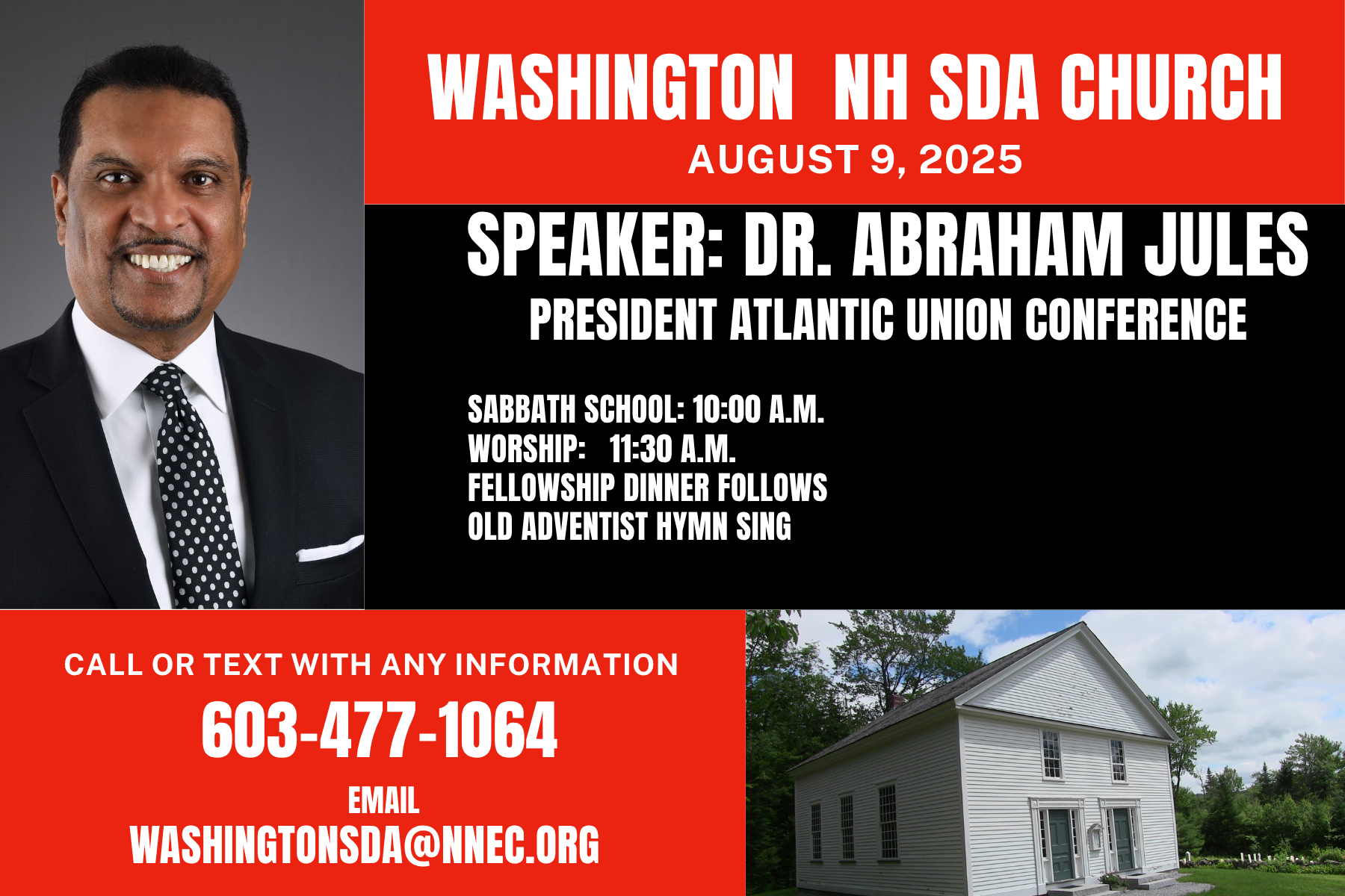 Washington NH SDA Church is holding Sabbath Services each Sabbath from May 16 through October 31, 2026. History Sabbath School starts at 10:00 a.m. Worship Service at 11:30 a.m. A Fellowship Dinner follows. Please bring a dish or two. After the Fellowship Dinner, a Cemetery Tour will occur. *Changes to this schedule may be made to meet the needs of visiting groups.