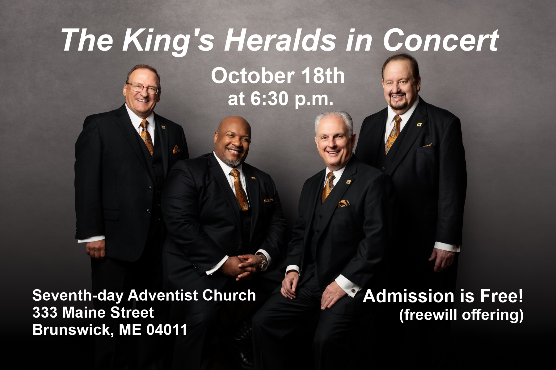 The Kings Heralds will be coming to the Brunswick Seventh-day Adventist Church on Saturday night, October 18 at 6:30 PM, for their only 2025 concert in Maine. The church is located at 333 Maine Street, Brunswick, ME 04011. Admissions is free! Only a freewill love offering will be taken. The Kings Heralds are the world's longest running gospel quartet, soon to enter their 100th year.